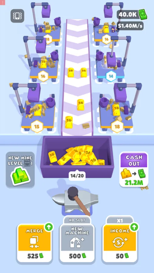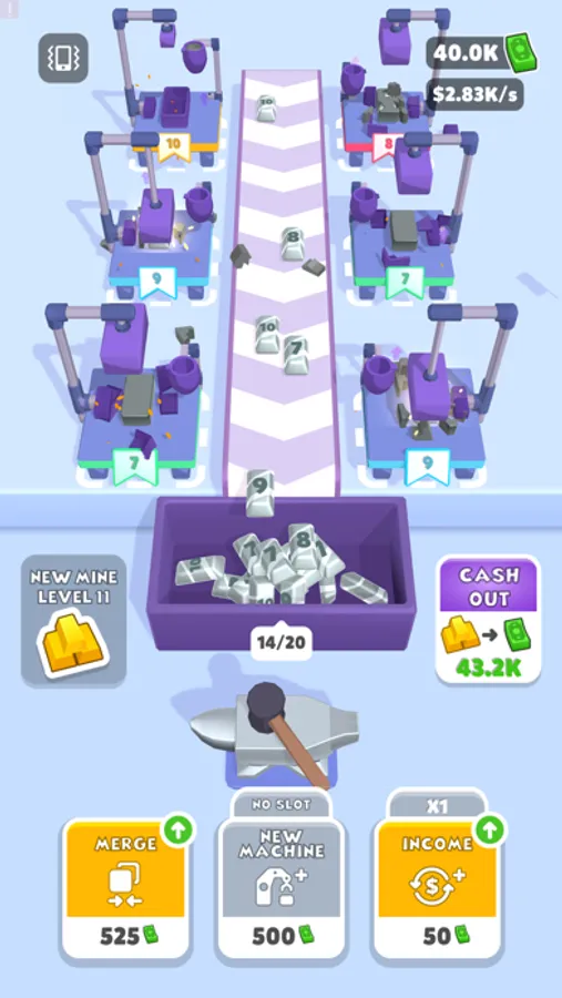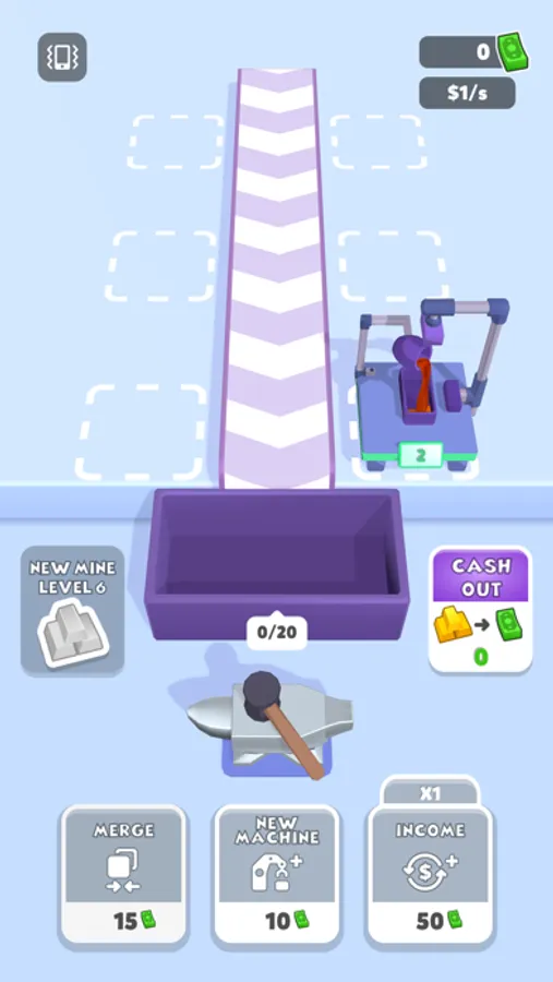 Shape mines by breaking them to make money. Buy new machines and merge them with the money you earn. Machines produce ingots depending on their level. The amount of money ingots earn depends on their level. You can sell the ingots accumulated in the box by pressing the cash out button. You have to level up your machines to reach different mines. Don't forget to hit the anvil to speed up production and earn more money.