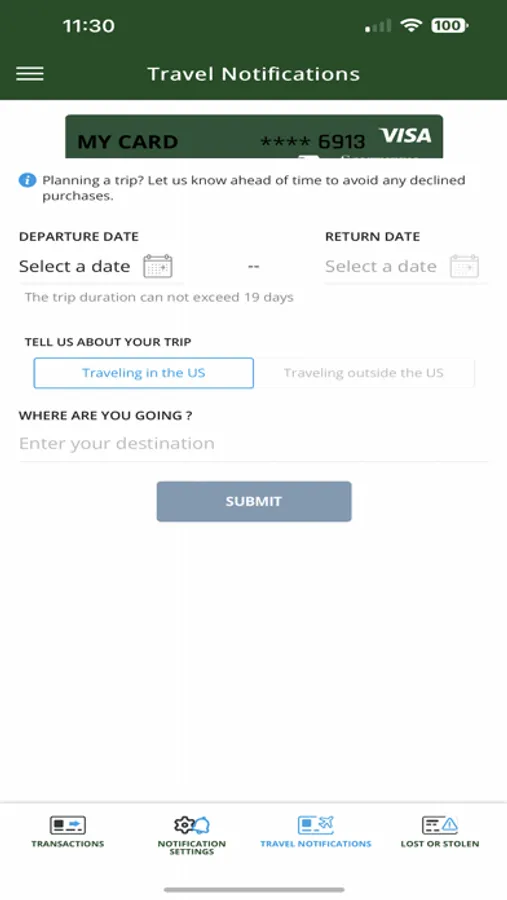 • Set your own travel notifications- don’t have your card denied for out-of-town purchases, set it and forget it