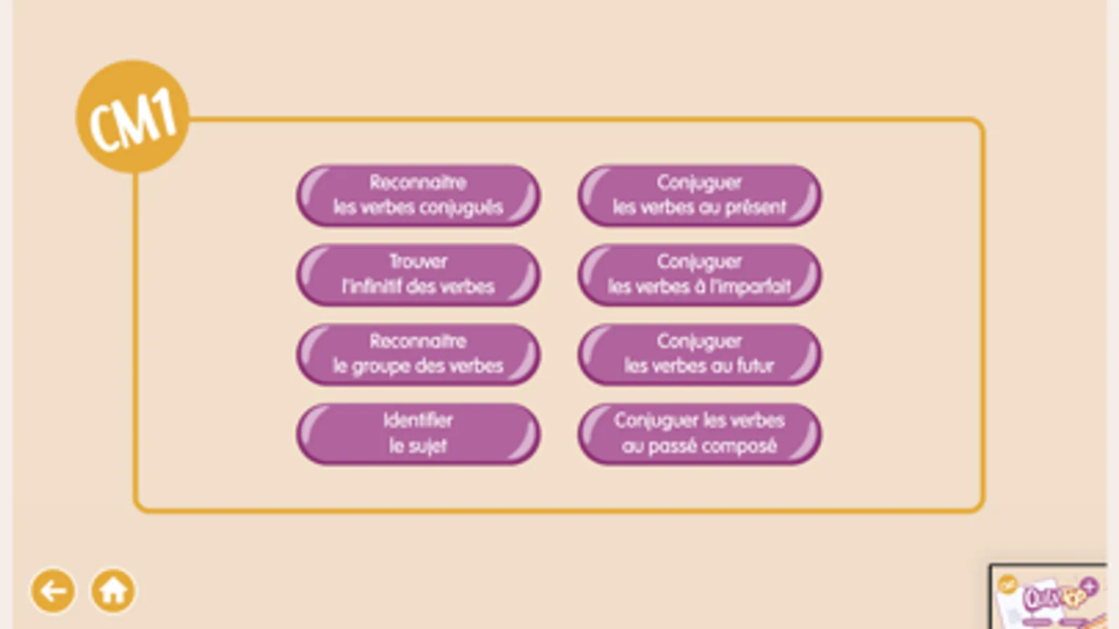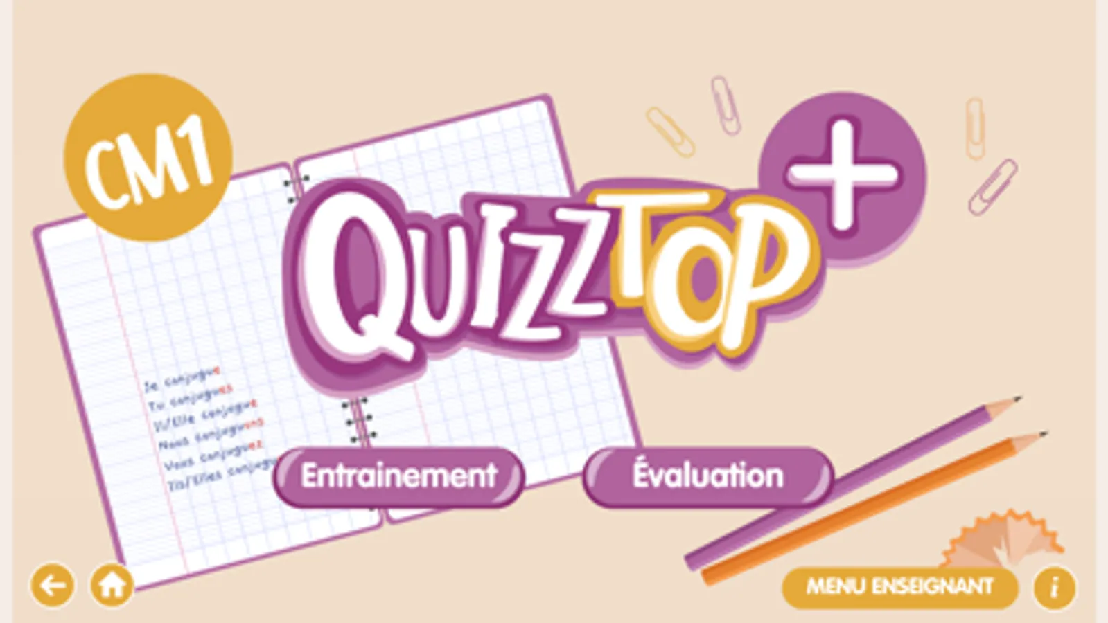 Quizztop+ Conjugaison CM1 propose 8 exercices déclinés en 3 niveaux :