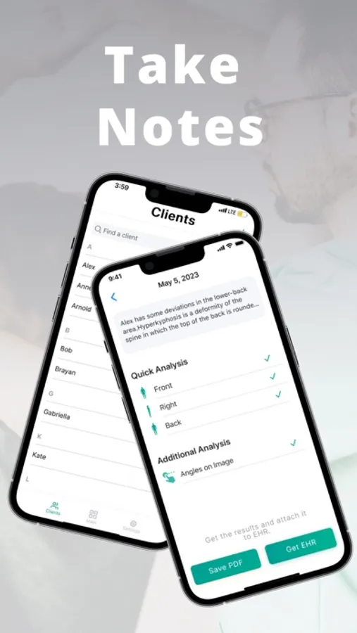* Use our tool as a goniometer to measure the body part tilts and get a quick and detailed assessment of the patient’s posture from different body sides (front, back, right, left)