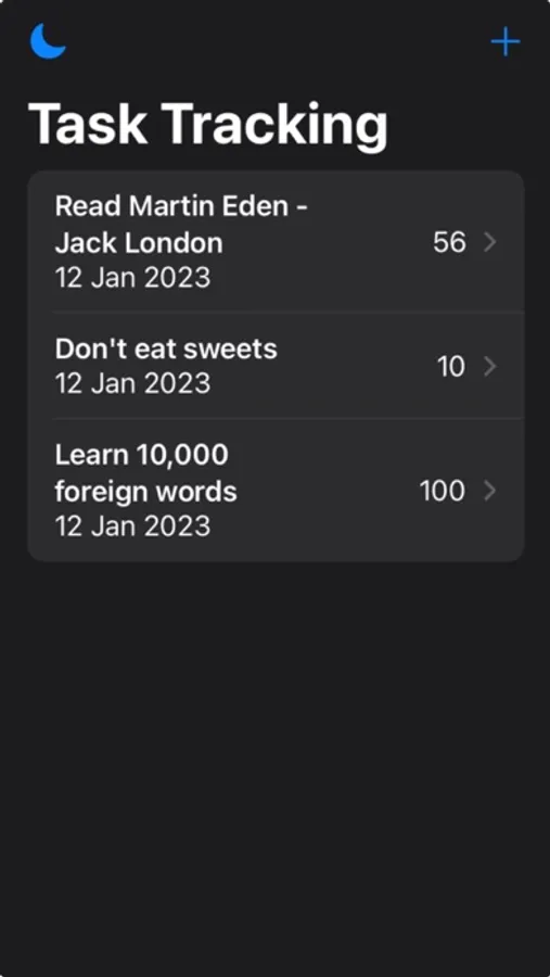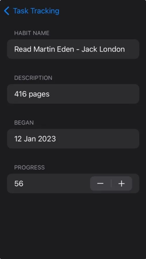 The "Task tracking Pro" application was created to track the progress of tasks. There are four items in the application: 1) the name of the task, 2) the description of the task, 3) the start date of the task, 4) tracking habits using the plus and minus buttons, progress is displayed on the main screen in numbers. For example, you created a task with the name - don't eat sweets, then added the number of days without sweets to the description, after that you set the date from which you started following the habit, and use the plus and minus buttons to adjust your progress. The app also has a simple and intuitive interface for everyone.