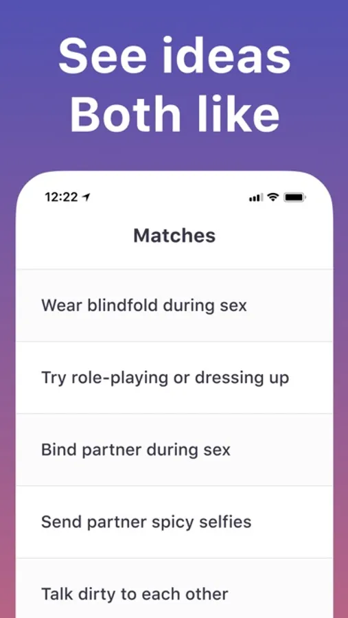 The matches are a list of sex ideas you both want to try. Any response of "No" by either partner will be hidden.
