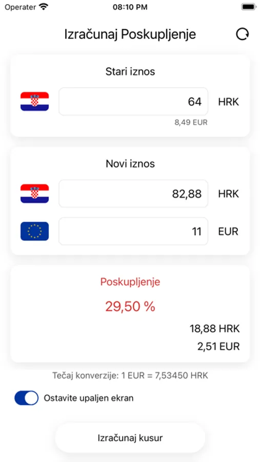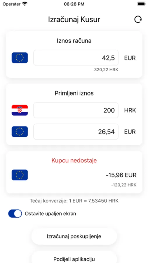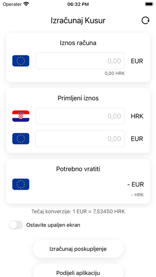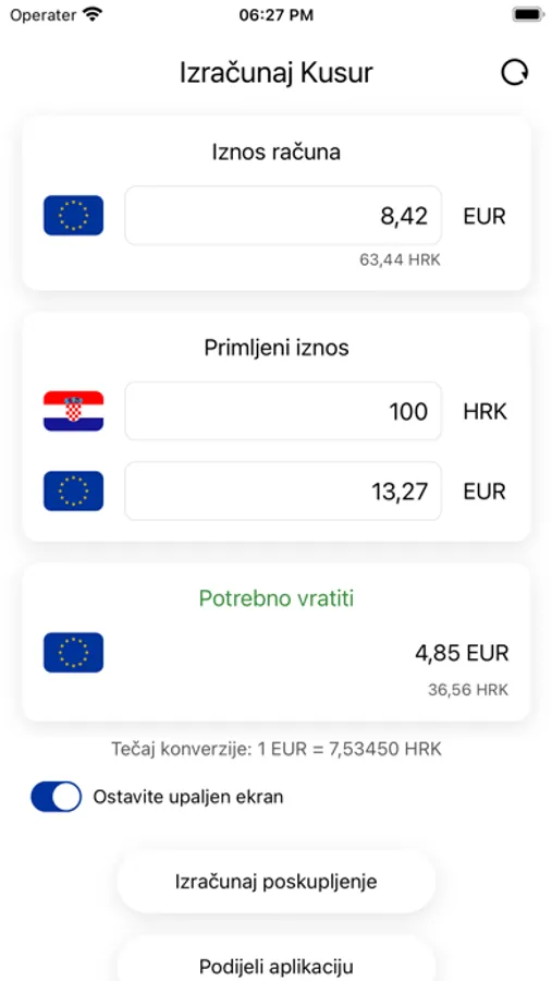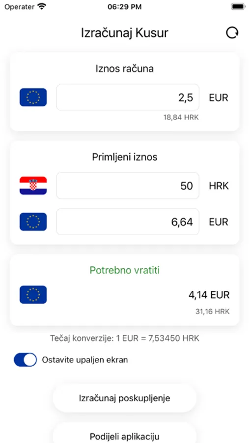 Aplikacija se može koristiti i kao kalkulator za promjenu eura u kune i obrnuto.