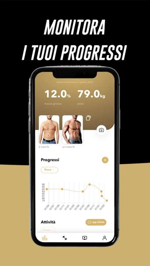 Avrai sempre sotto controllo la tua attività fisica: potrai visualizzare quali esercizi sono previsti nel tuo piano di allenamento, i tuoi progressi e come cambia il tuo fisico nel corso del tempo.