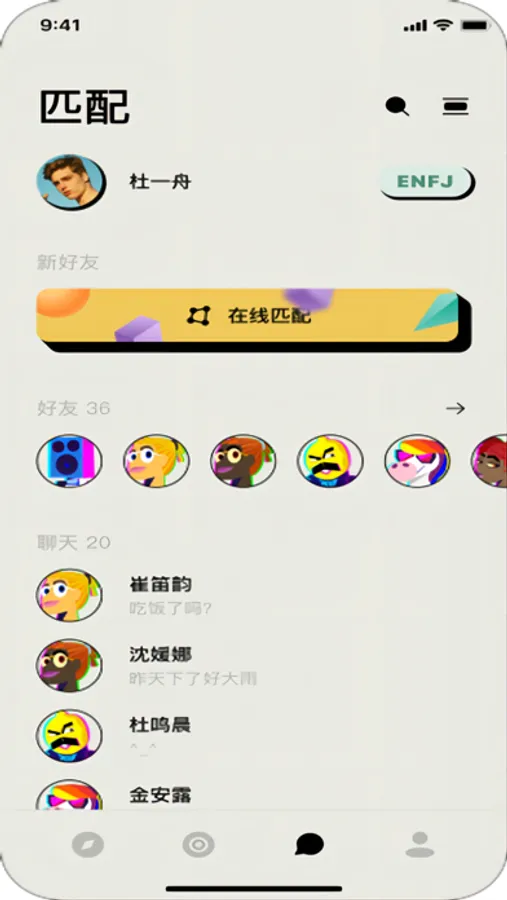 通过匹配系统,用户和用户之间通过MBTI人格测试,使用匹配功能建立联系。MBTI测试完成后,会生成可见的测试结果,其会在一定程度上影响后续匹配的分配对象。
