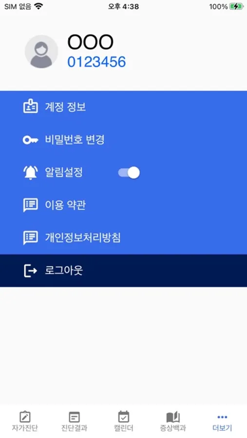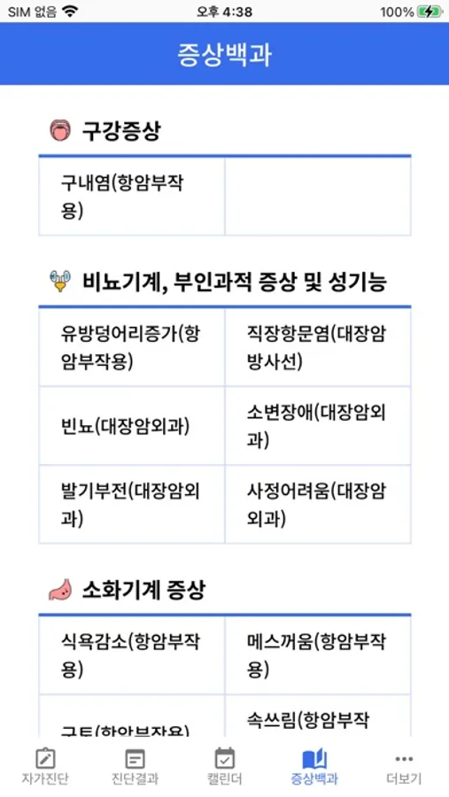 - 증상 입력 : 부작용 별로 설문을 통해 현재 증상에 대해 기록 할 수 있습니다.