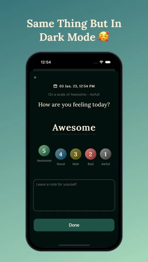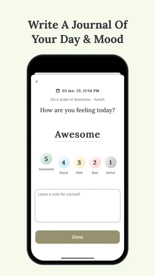 Rate your day on a scale of Awesome to Awful — 5 is Awesome, 4 is Good, 3 is Meh, 2 Bad, and 1 is Awful. You can set the date and time of your entry, jot down your thought and feelings of the day into your diary.