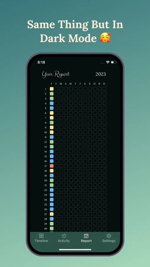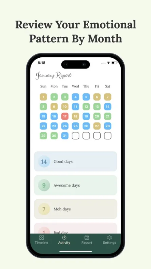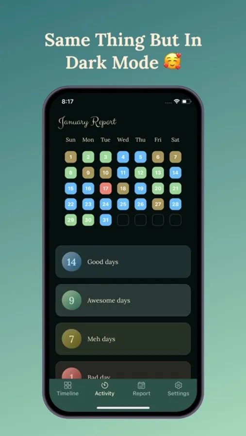 All your monthly entries are display in a calendar, and summarised in a color coded list. Here you can see how many time you had Awesome, Good, Bad, Meh, Bad, or Awful days. You can go back to previous months by clicking on the month at the top left corner.