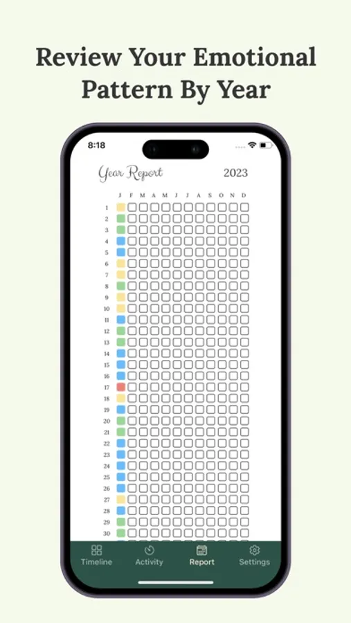 Your entire mood for the year is display in a grid of 372 cells. With each cell representing 1 day of the year and the extras cells from shorter months are used as fillers.