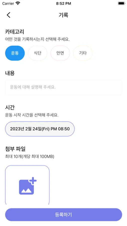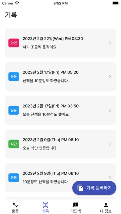 기록 탭에서 운동, 식단 등을 사진이나 동영상으로 기록할 수 있어요.