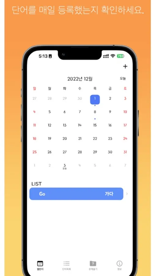 단어를 등록하면 캘린더에 작은 동그라미로 체크가 됩니다.