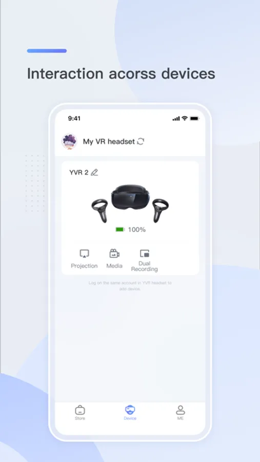 It supports casting VR content to the mobile phone, or dual recording, in order to share the VR experience with friends around you. You can also easily manage VR media files on YVR Assistant.
