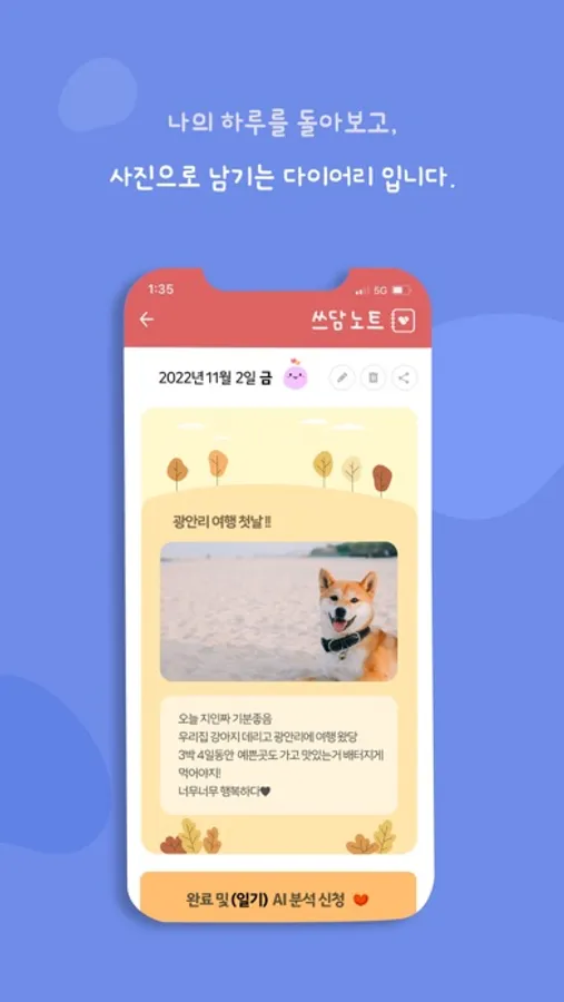 1. 하루에 있었던 일을 쉽고 빠르게 작성, 사진으로 쓰는 다이어리 어플이다.