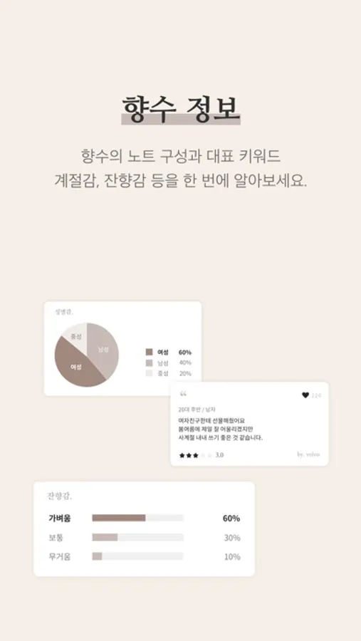 향수의 노트 구성부터 키워드, 잔향감, 계절감, 가격 정보와 조향 스토리까지,