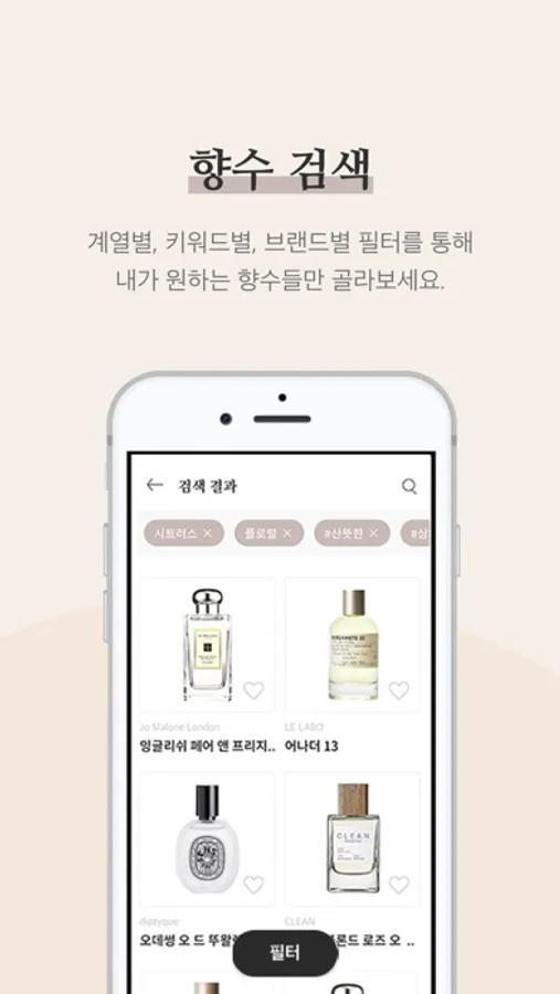 향료, 키워드, 브랜드 필터를 통해 내가 원하는 향수를 쉽게 찾아보세요.