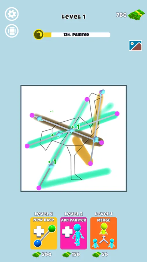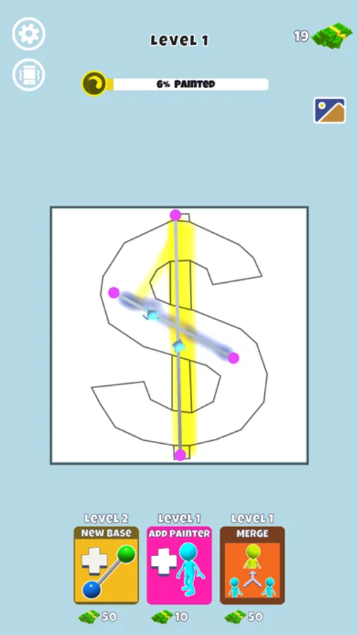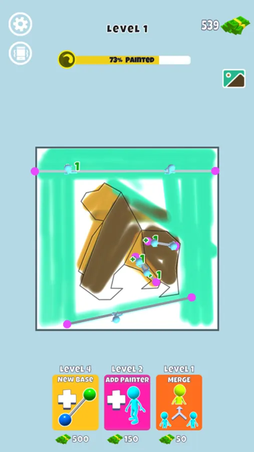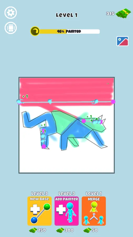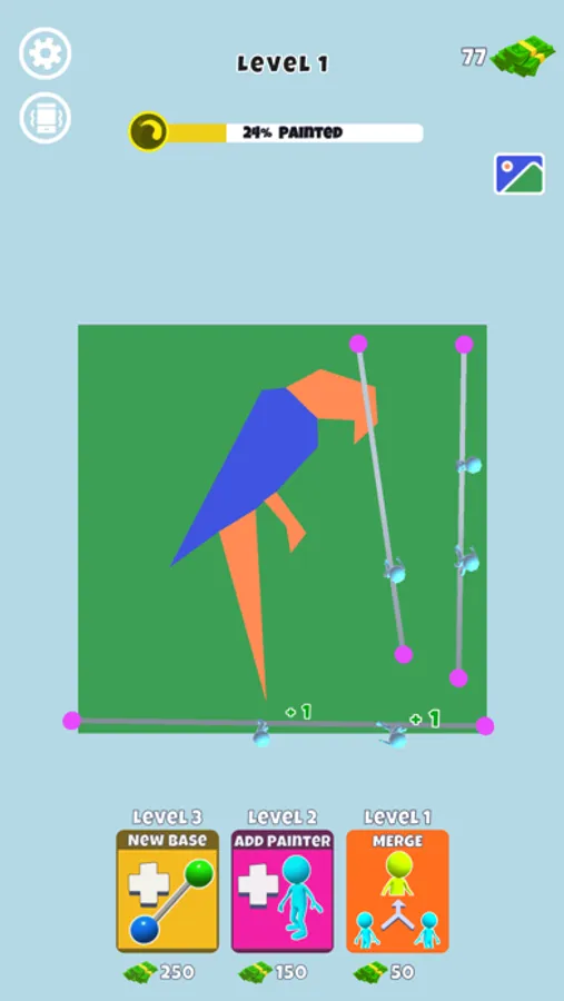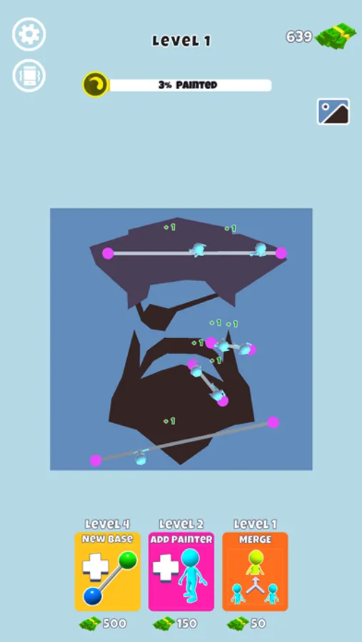 Buy workers to fill your canvas, but make sure to paint the right amount! Spend money to buy more colors and more workers to fill faster and better. Try to paint as close to reference image!