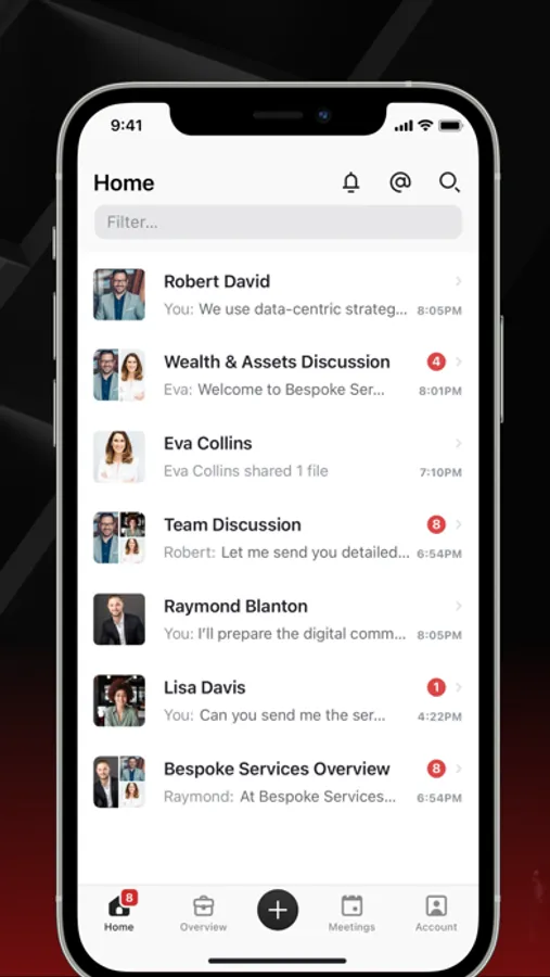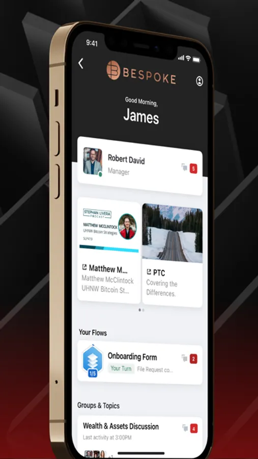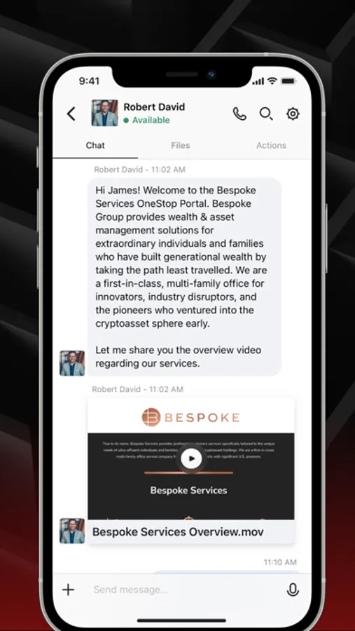 The Bespoke Portal app provides secure and transparent communication within a comprehensive portal. Use our app to send messages to our team, attend digital meetings, share documents, sign contracts, stay updated on your advisory plan, and more.