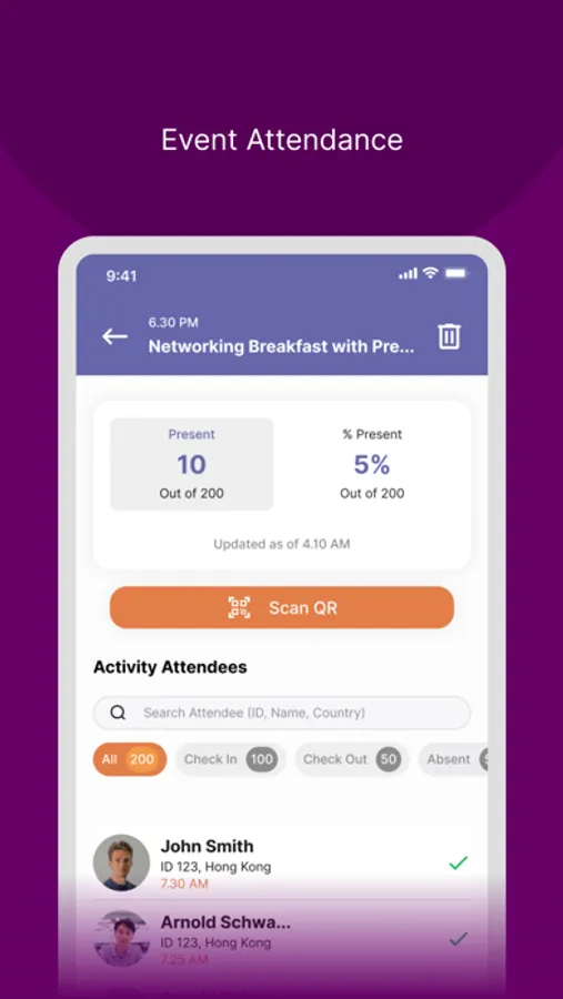 Extend the mileage out of your event with your attendees with an experience that allows the event organizers to easily view and verify registered attendees, scan QR Code ticket, track attendance, and provide personalized information to attendees like seating information among others. And registration data is synchronized across multiple devices in real time.