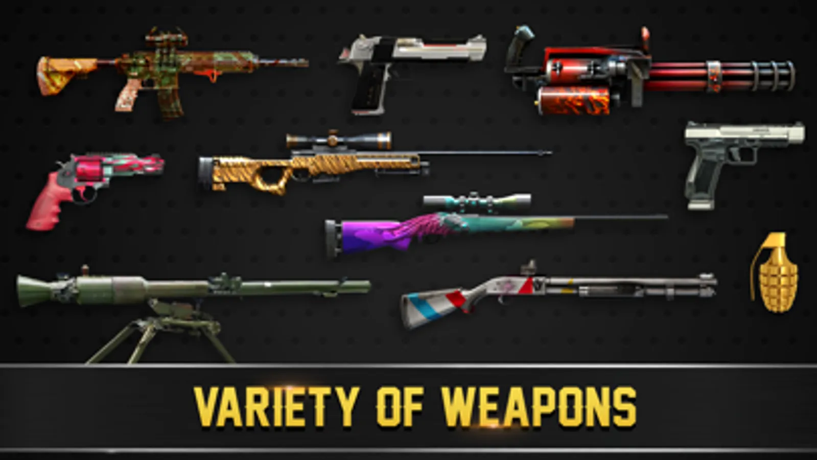 Various powerful weapons collection from different categories: Pistol, machine, rifle, revolver, shotgun etc