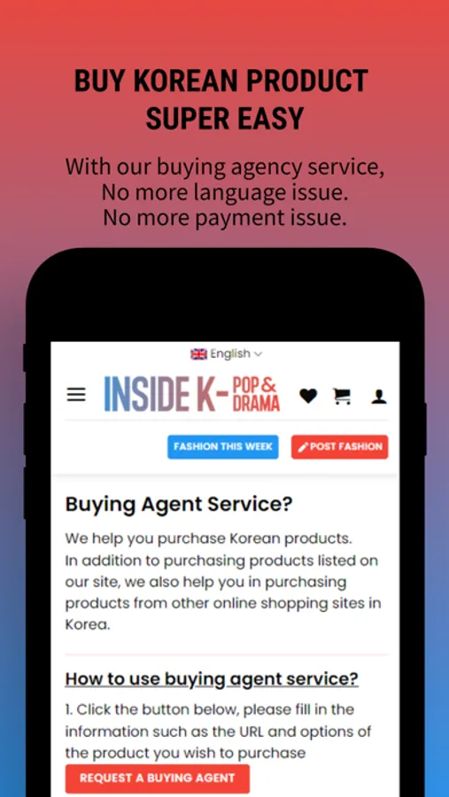 - With 'Buying Agent Service', you will no longer have to face language and payment issues when purchasing Korean products.