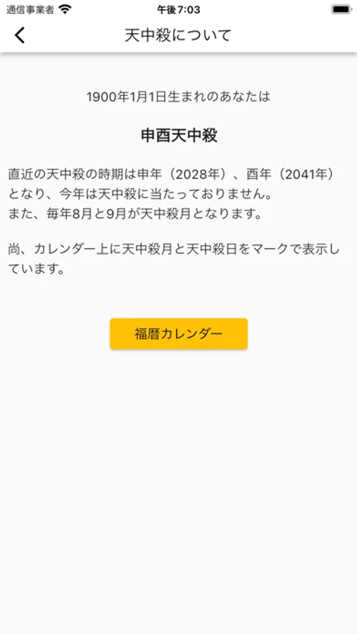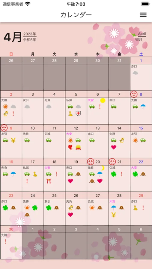 月間カレンダー画面から日付をタッチするとその日の吉凶を星の数でわかりやすく表現しております。
