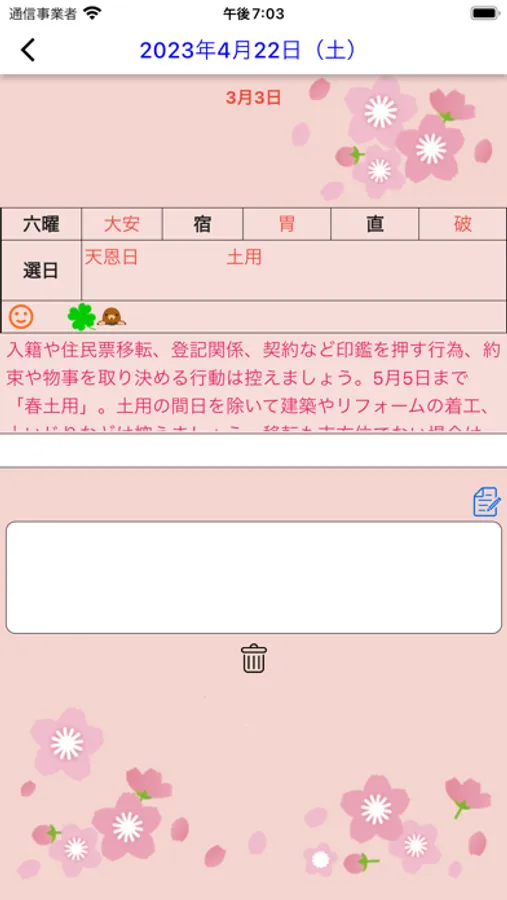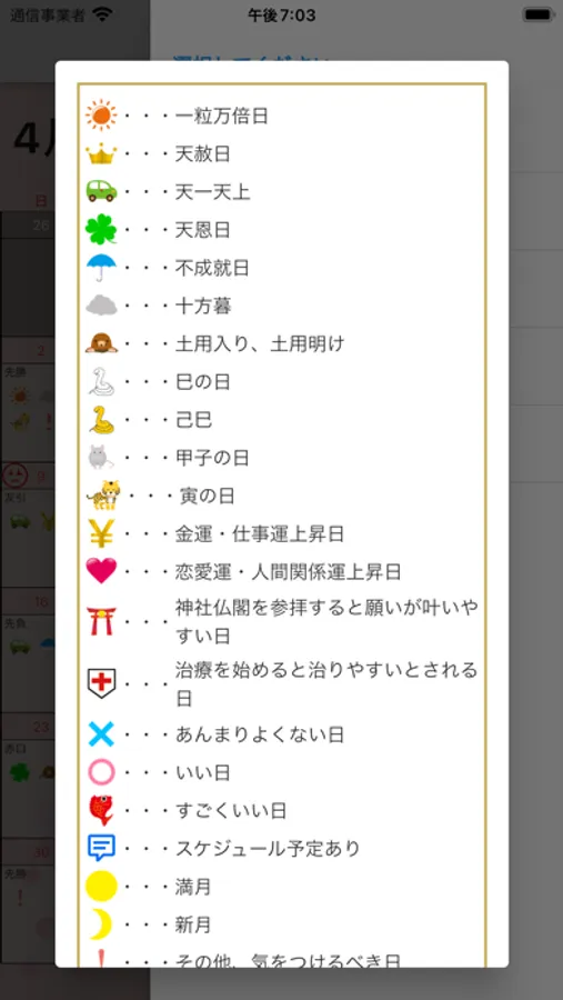 一粒万倍日、天赦日、天一天上、天恩日、不成就日、十方暮、土用、己巳の日、仕事運、金運、恋愛運、人間関係運上昇日、神社仏閣を参拝すると願いが叶いやすい日、治療を始めると治りやすいとされる日、あまりよくない日、いい日、すごくいい日、その月の最大吉日、満月、新月、天中殺、その他の注意が必要な日