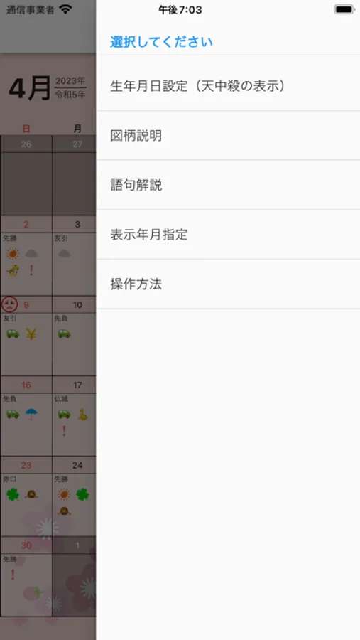 このアプリは、和暦にもとづき、暦注(六曜、十干十二支、十二直、二十八宿)と選日(一粒万倍日、天赦日、不成就日、天一天上、天恩日、十方暮)等をカレンダー上に見やすく表示したものです。