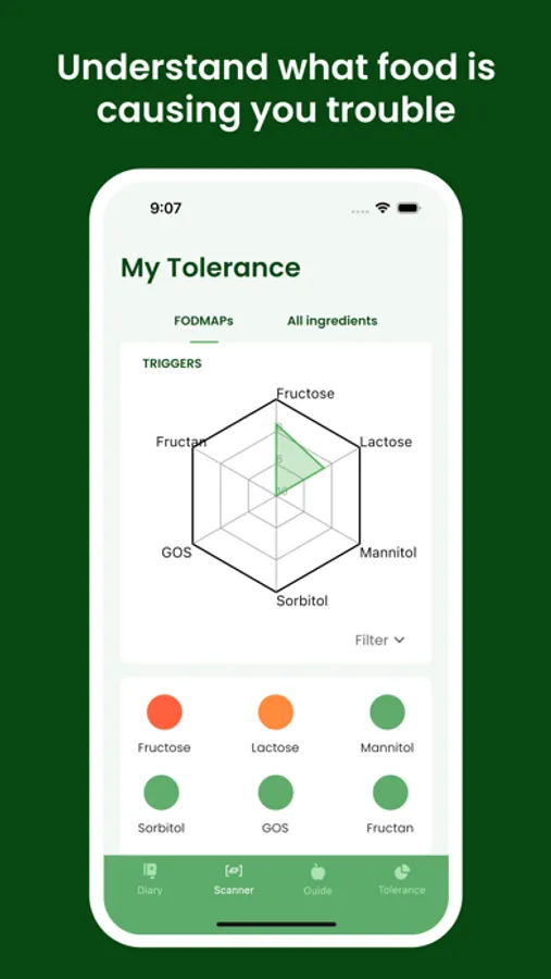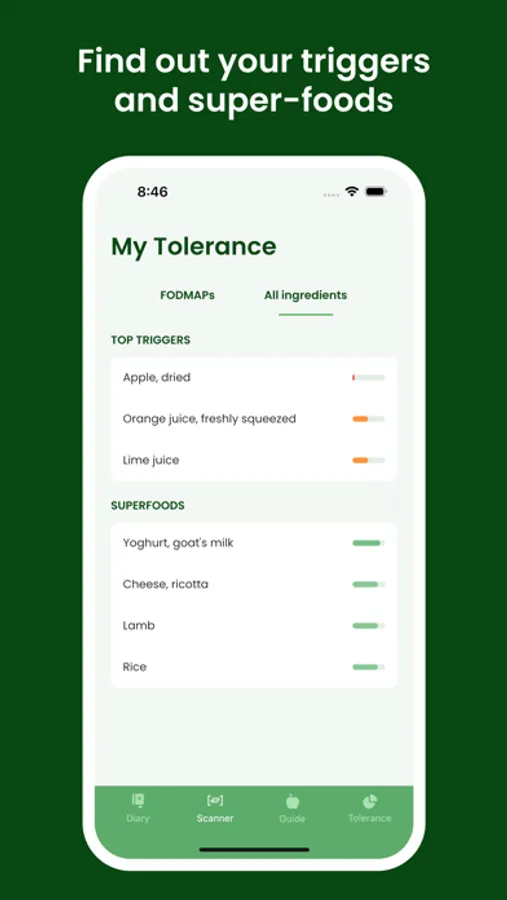 UNDERSTAND YOUR TRIGGERS AND SUPER-FOODS. In addition to FODMAP tolerance analysis, find out what ingredients are causing you trouble or no symptoms at all. Track not only ingredients from the food guide, but any ingredient or meal you eat!