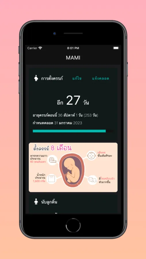 Mami แอปพลิเคชั่นสำหรับคุณแม่ มีตัวช่วยในการติดตามอายุครรภ์ การนับลูกดิ้น รวมถึงแนะนำความรู้เรื่องโภชนาการและคำแนะนำต่างๆในการดูแลตนเองขณะตั้งครรภ์