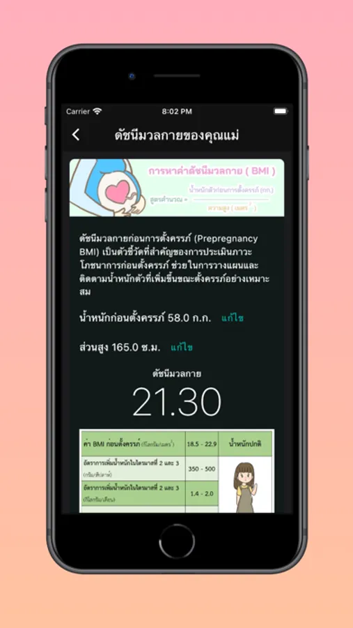 คำนวณค่าดัชนีมวลกายก่อนการตั้งครรภ์ และสามารถบันทึกน้ำหนักตัวที่เพิ่มขึ้น เพื่อเป็นตัวช่วยในการวางแผนและติดตามน้ำหนักตัวขณะตั้งครรภ์