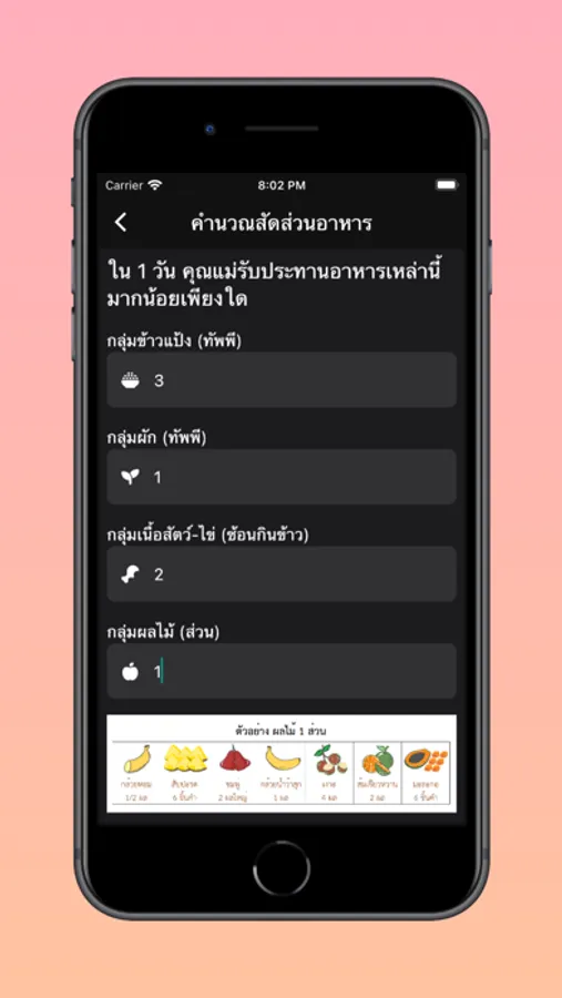 ตัวช่วยคำนวณปริมาณอาหารที่รับประทานในกลุ่มข้าวแป้ง กลุ่มผัก กลุ่มเนื้อสัตว์-ไข่ กลุ่มผลไม้ และนม ว่าเหมาะสมหรือไม่