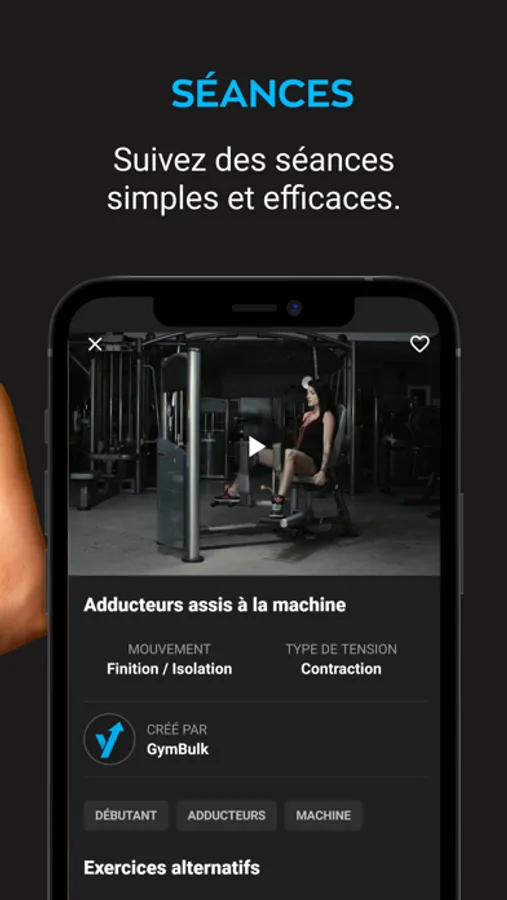 Chaque exercice est expliqué avec une vidéo explicative (+ de 500 exercices vidéo) du mouvement, le nombre de répétitions à faire, la charge à utiliser ainsi que le temps de repos à prendre.