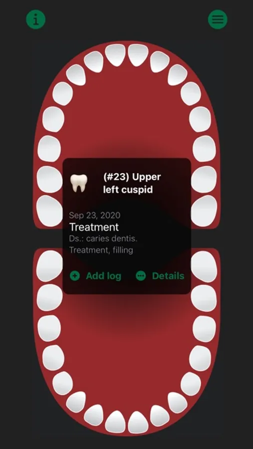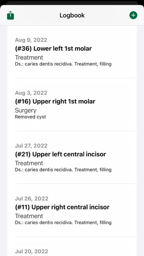 Simple Dental Logbook lets you keep track of your visits to the dentist, including regular check ups, teeth cleaning, whitening, treatment, etc.