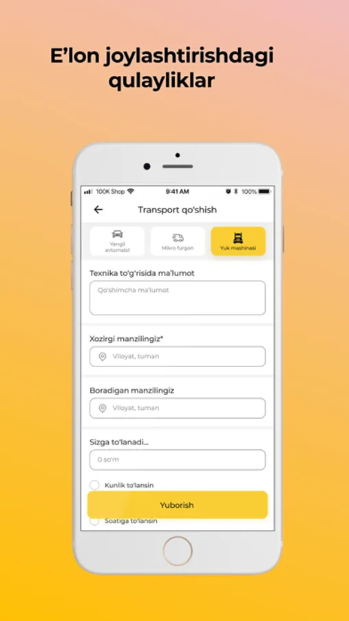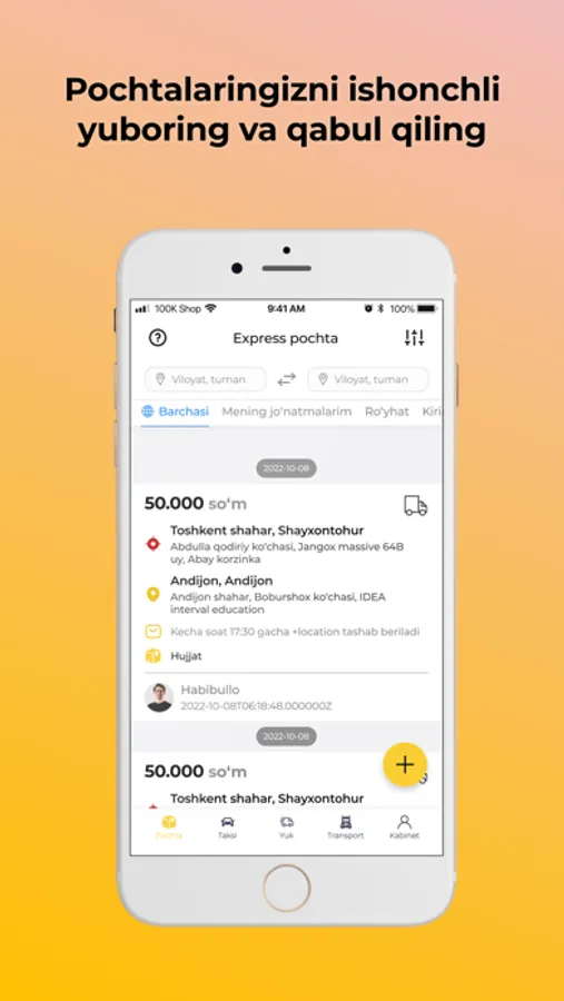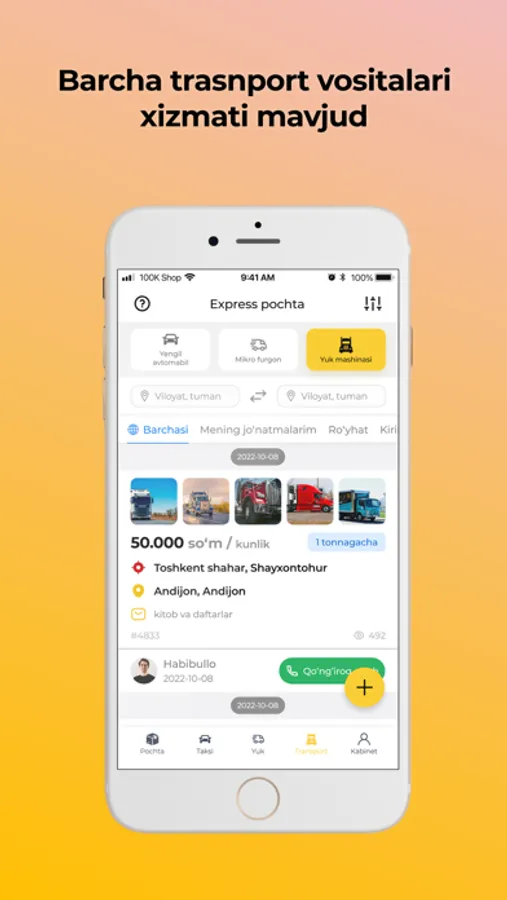 Универсал Мобиле 100к Ехпресс иловаси Ўзбекистон бўйлаб йўловчи ва юк ташишга буюртма бериш учун ягона логистика хизматидир.