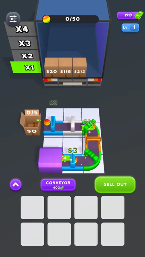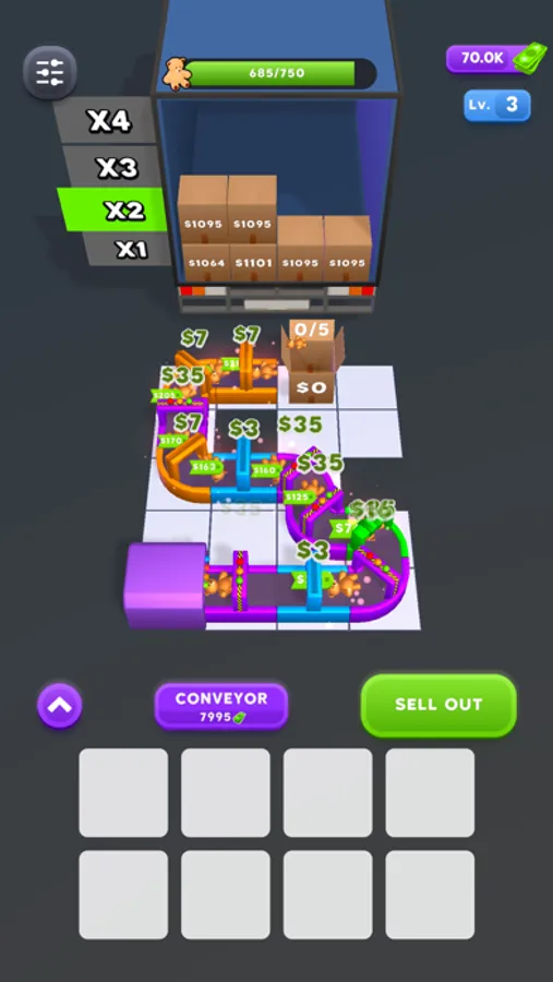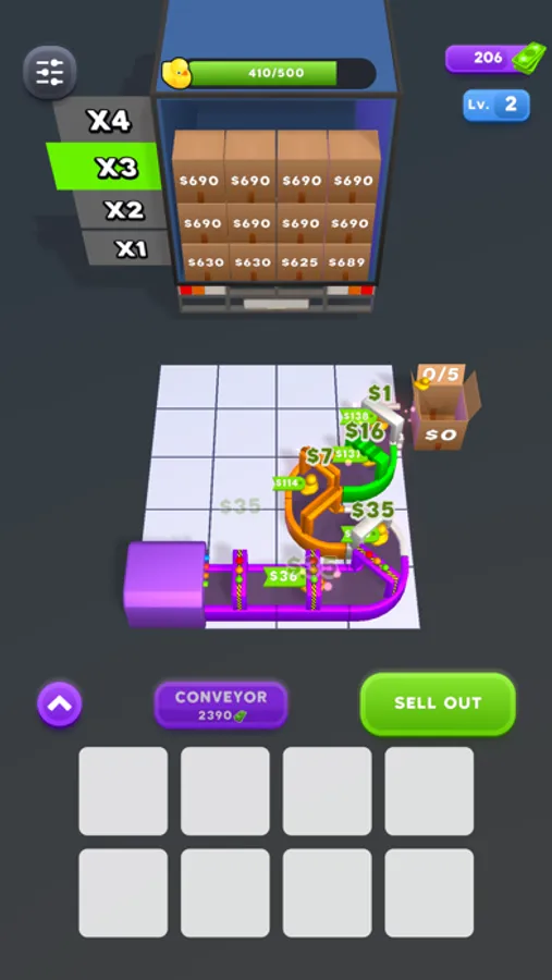 Buy conveyors and merge them to increase profit. Upgrade to earn faster.