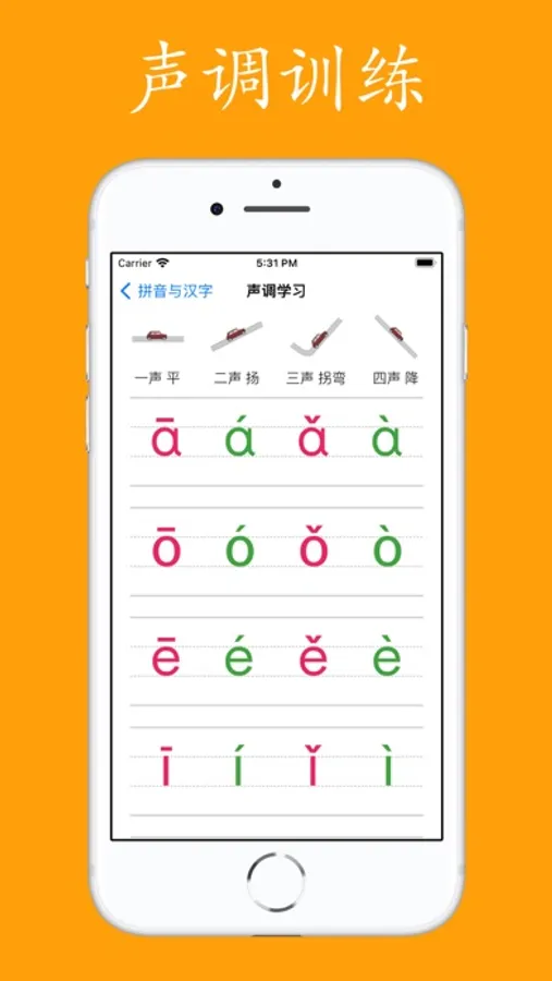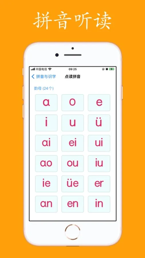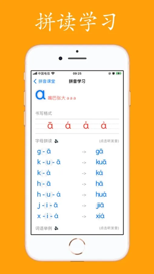 包含声母,单韵母,复韵母以及整体认读音节,针对每个字母单独进行发音和口型的学习记忆,学习四声调的读法,词语应用示例。