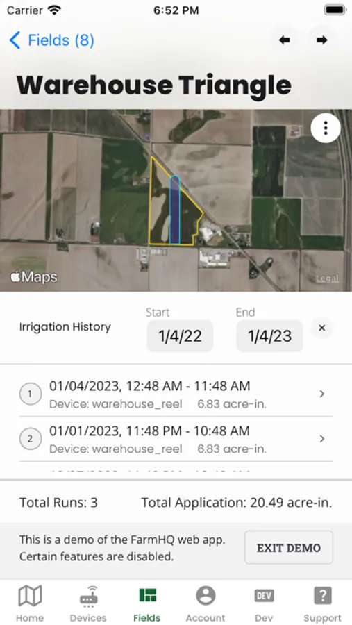 - The Fields screen allows users to manage their fields and view historical irrigation data.