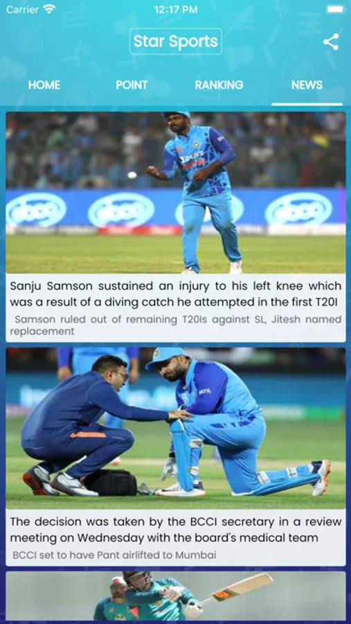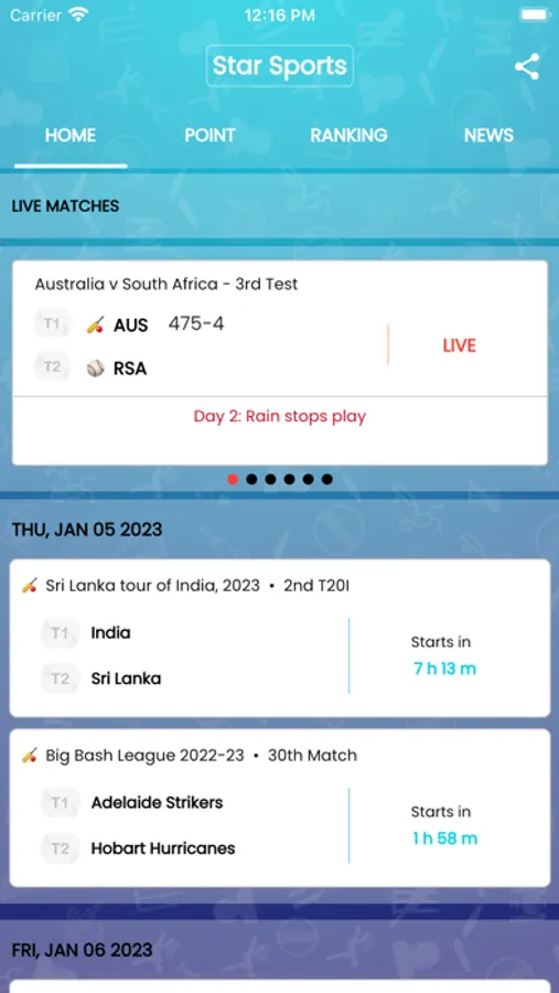 Star Sports - Cricket Live, provides the fastest live score with ball by ball commentary of every cricket match around the world such as T20, ODI and Test matches.