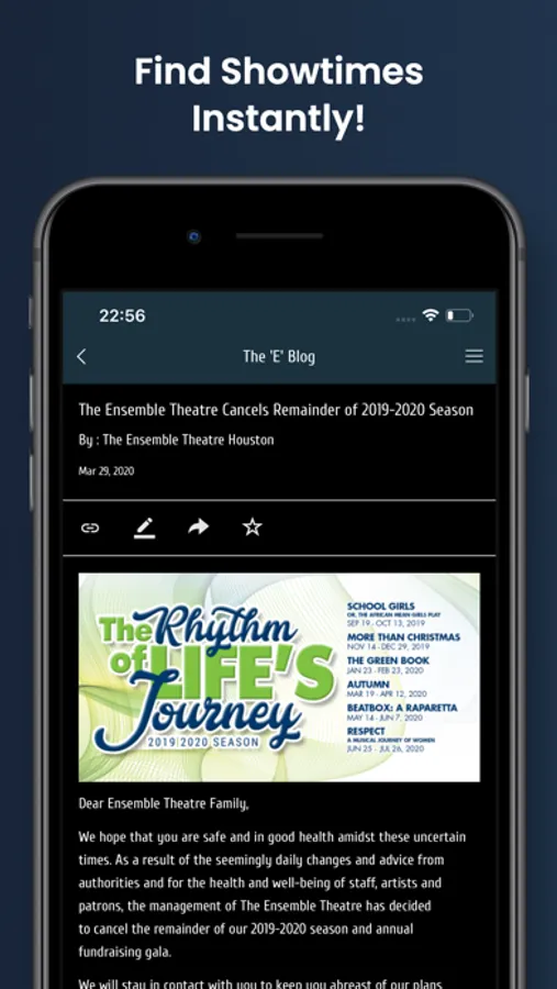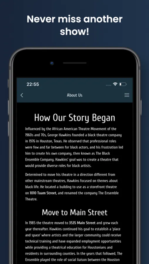 The Ensemble Theatre mobile app features daily showtimes and upcoming performances. The app provides instant access to available showtimes, seats, pricing, photos, and theatre information. Explore what The Ensemble Theatre has to offer by connecting with the community on our community wall. Never miss another show!