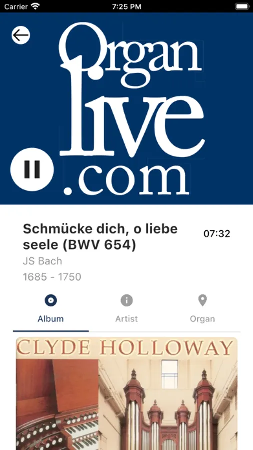 With our mobile app, enjoy listening to Organlive on the go. The mobile app features extra information about the organist and organ played during the recording (when available), in addition to a history of recently played tracks.