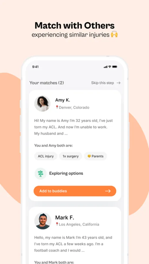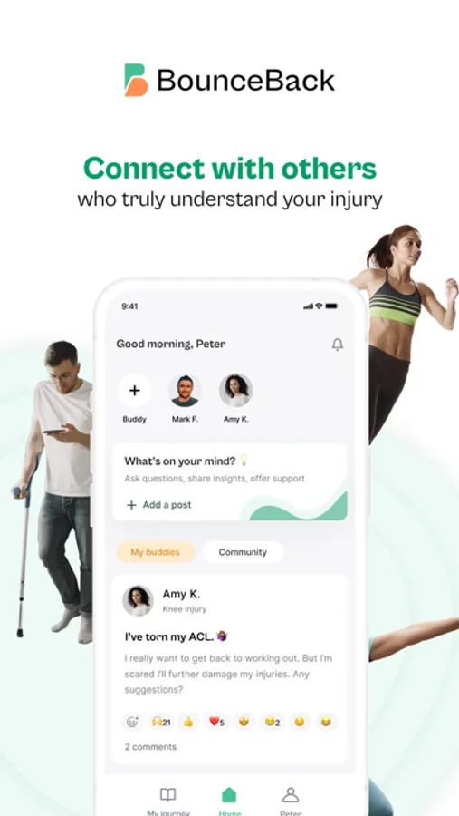 Connect with others who have an orthopedic injury to increase your mental fitness throughout recovery. BounceBack provides a platform for emotional and informational support throughout the injury recovery journey.