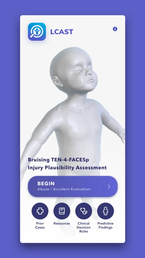The Lurie Children’s Child Injury Plausibility Assessment Support Tool (LCAST) is an app based on a validated Bruising Clinical Decision Rule (BCDR) called the TEN-4-FACESp. Use of this tool has the potential to improve recognition of abuse in young children with bruising. This app functions only as a screening tool and cannot be used to diagnose abuse. The app applies to children less than 4.0 years of age with bruising. If the child is older than 4.0 and/or bruising is not present, this tool cannot be used. In those circumstances, alternative methods of screening for abuse are needed.