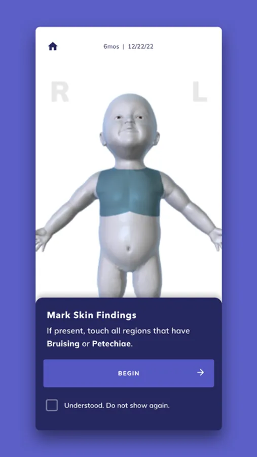 ABOUT THE APP: The app is intended for clinical use by licensed healthcare professionals and providers. The app can inform decision-making and be used as an educational tool for learning about bruising characteristics that commonly result from abusive and accidental injury. The core feature of the app is an interactive 3D body model that allows the user to utilize visual cues of the human body to input clinical observations. The result is the opportunity to compare a child’s bruise findings to the published evidence resulting from a NIH-funded multi-center study. The data that drive the app are based on 2,161 patients of which 410 (19%) were classified by a multi-disciplinary panel of medical experts as abuse and 1,713 (79%) as accident. The TEN-4-FACESp bruising clinical decision rule resulted from analysis of 35 body regions and is 96% specific and 87% sensitive for distinguishing bruising from abuse versus accident. The TEN-4-FACESp has three components based on: 1) specific body regions with bruising, 2) patterned bruising, and 3) bruising anywhere on non-mobile infants. An affirmative finding for any one of the three TEN-4-FACESp components without a clear and reasonable explanation indicates a potential risk for abuse. The child may warrant further evaluation and consultation with an expert in child abuse should be considered.