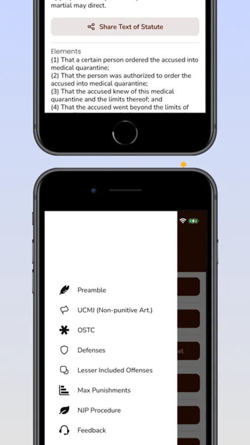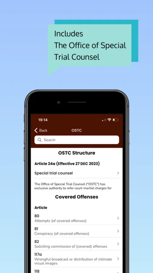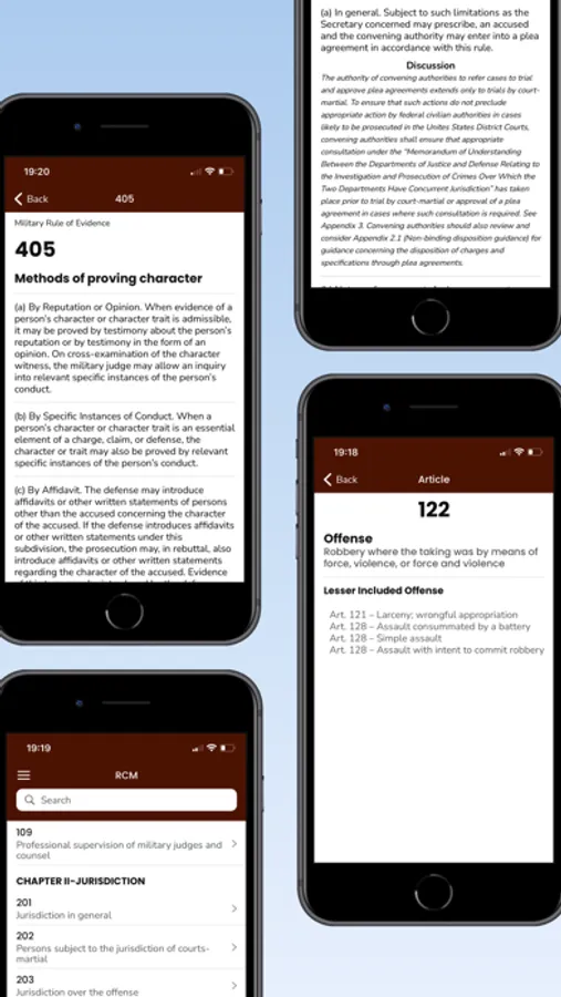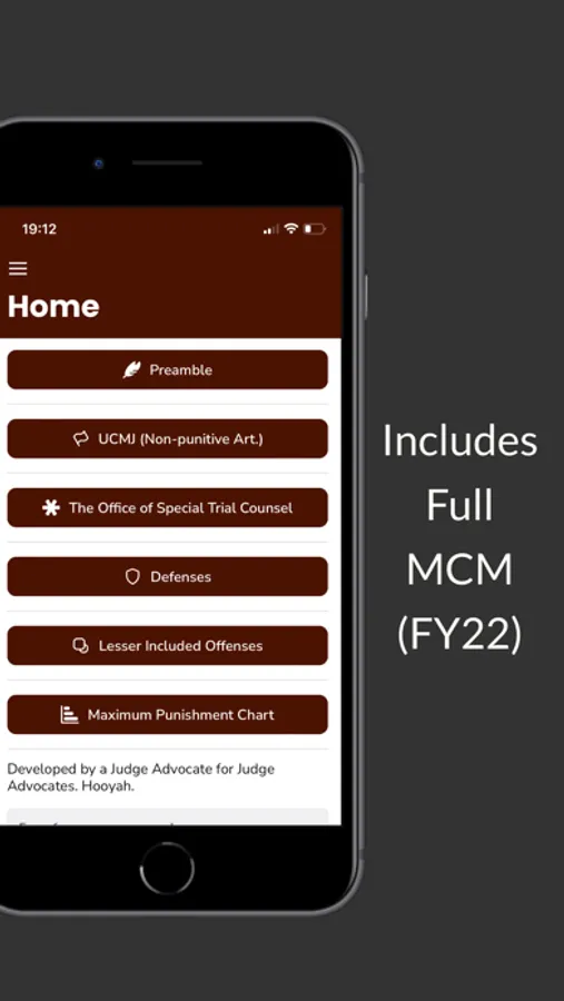 The Judge Advocate App is an essential accessible resource for any servicemember or civilian who references the Uniform Code of Military Justice. The Manual for Courts-Martial (MCM) is the offical guide for conducting Courts-Martial in the United States Military. This app is a searchable, digestable, distillation of the text of the MCM. The app features intutitive design based an Active Duty Judge Advocate interacts with the MCM. Commonly referenced sections are tabbed on the home screen.