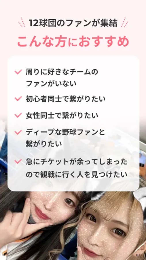 12球団のファンが居るのでプロフィールを見て気が合いそうだなと思えば「いいね」や「メッセージ」で情報交換したり友達になることができます。