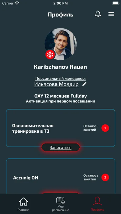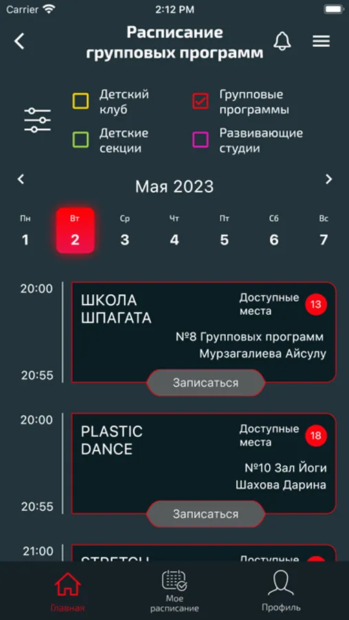 • Запись на групповые программы, персональные тренировки, детские секции и дополнительные услуги