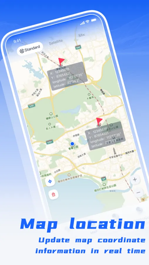 - Map positioning, updating the map coordinate information in real time, marking the specific position of longitude and latitude coordinate data on the map;