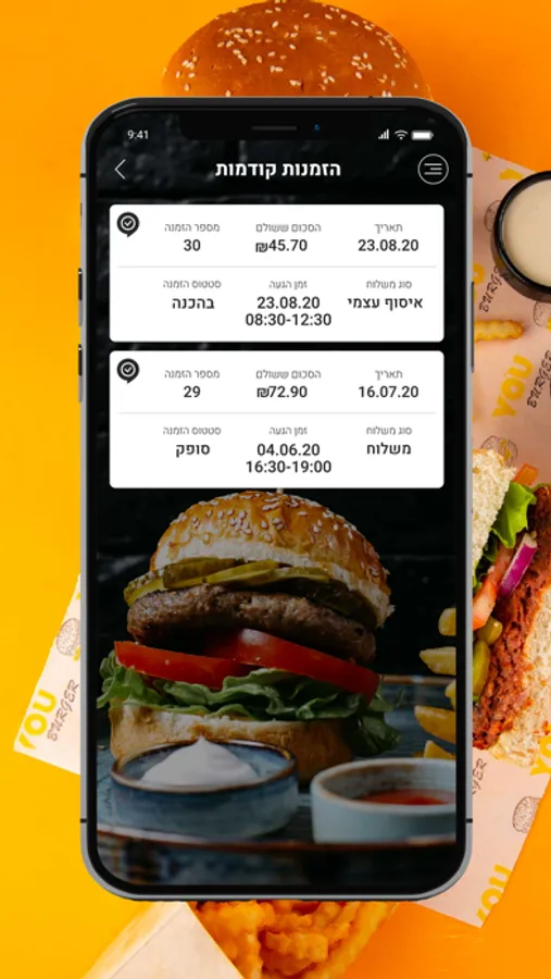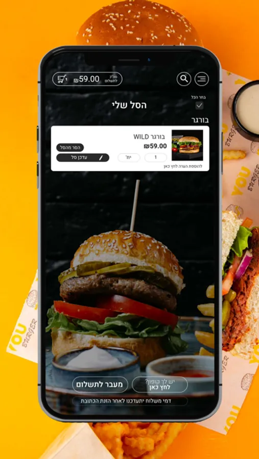 ניתן לבצע הזמנות ומשלוחים ישירות מהאפליקציה You burger.