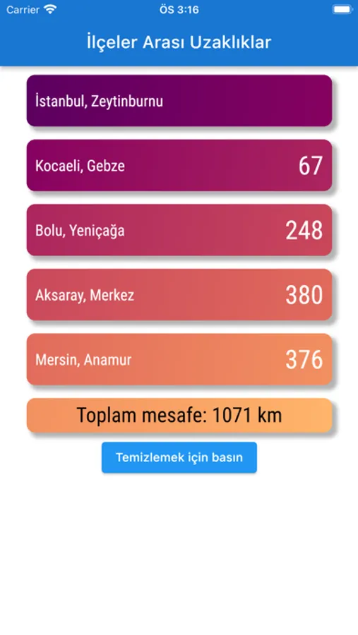 Uygulama; her nokta için bir önceki nokta ile arasındaki uzaklığı ve güzergahın toplam uzaklığını hesaplar.