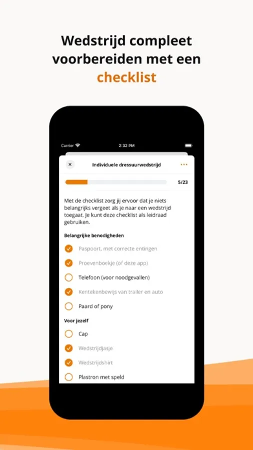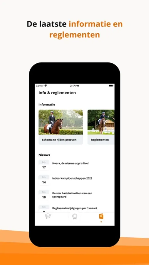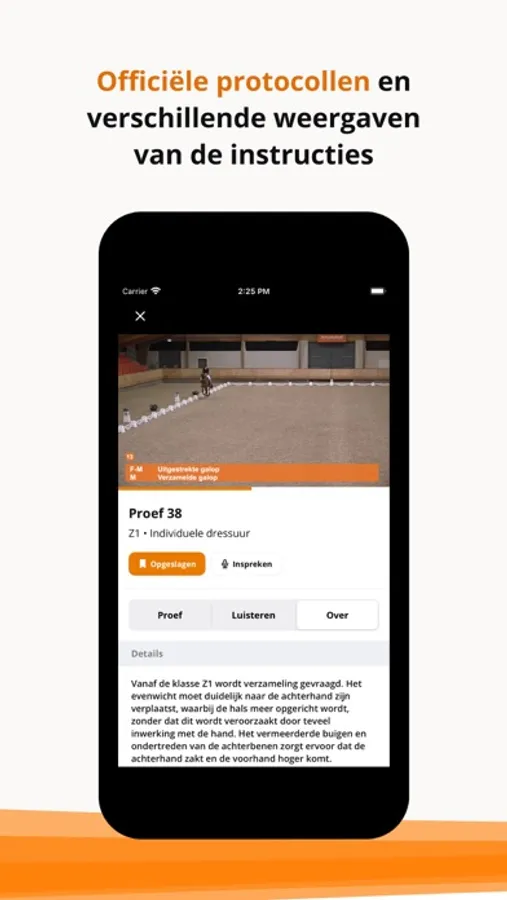 Nieuw in deze app is de voorleesmodus, hiermee kun je op een overzichtelijke wijze je proeven (laten) voorlezen. Ook vind je hier verschillende tools die je helpen bij je voorbereiding zoals een checklist. Voor een aantal proeven is vooraf opgenomen audio beschikbaar zodat je direct kunt gaan oefenen. Verder houden we je via de nieuwsfunctionaliteit op de hoogte van het laatste belangrijke nieuws omtrent dressuurproeven.